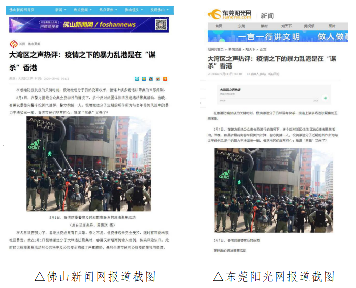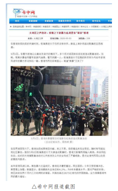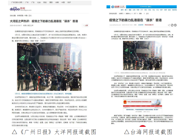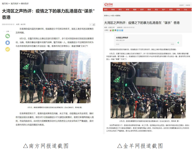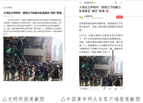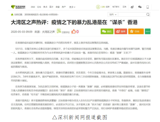 中央廣播電視總臺(tái)“大灣區(qū)之聲”5月3日刊播題為《大灣區(qū)之聲熱評(píng):疫情之下的暴力亂港是在“謀殺”香港》的評(píng)論文章,對香港極端激進(jìn)分子在疫情之下仍然沒有收手,一再上演違法聚集、暴力亂港的丑惡鬧劇進(jìn)行揭露和批判。文章播發(fā)后受到廣泛關(guān)注,并迅速被眾多境內(nèi)外媒體、網(wǎng)站、微博、客戶端轉(zhuǎn)載、引用。