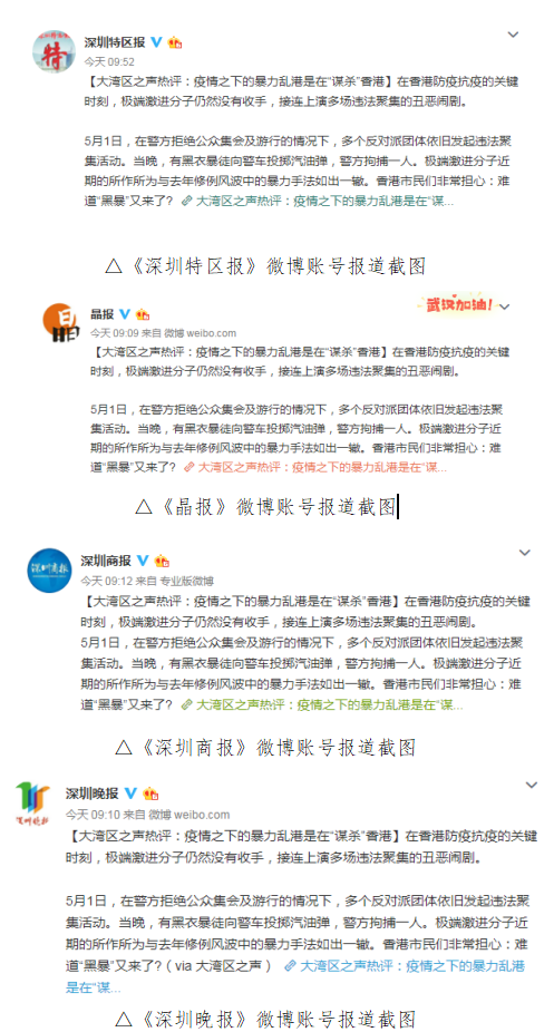 深圳特區(qū)報(bào)、晶報(bào)、深圳商報(bào)、深圳晚報(bào)等媒體微博賬號(hào)也廣泛轉(zhuǎn)載了這篇熱評(píng)文章,一致認(rèn)為,在疫情防控最關(guān)鍵最緊張的時(shí)刻,極端激進(jìn)分子若一再重演“黑暴”鬧劇,必將摧毀香港經(jīng)濟(jì)僅存的復(fù)蘇希望,變相“謀殺”香港。