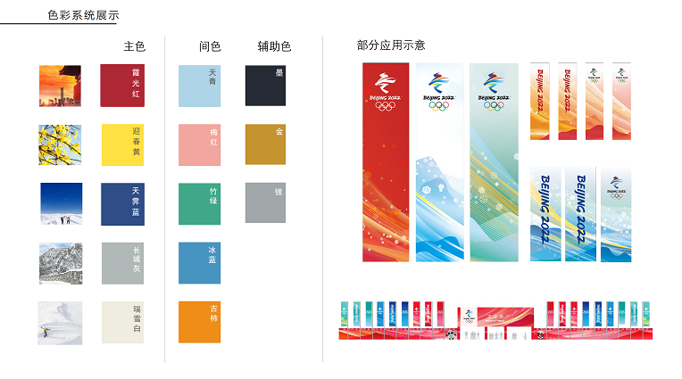 經(jīng)過對中國歷史上代表性色彩的挖掘,對中國色彩文化的提煉以及對北京、延慶和張家口三個賽區(qū)城市色彩的分析,設(shè)計了北京2022年冬奧會和冬殘奧會色彩系統(tǒng),