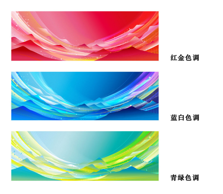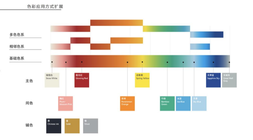 輔助色包括有墨、金、銀。色彩系統(tǒng)通過基礎(chǔ)色系、相鄰色系及多色色系等方式可以形成組合應(yīng)用。