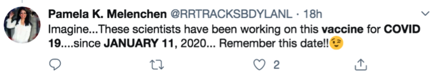 網(wǎng)民Pamela K.Melenchen稱,“想想看,這些科學(xué)家從1月11日就開始進(jìn)行疫苗研發(fā)了,請(qǐng)記住這個(gè)日期!”↓↓↓