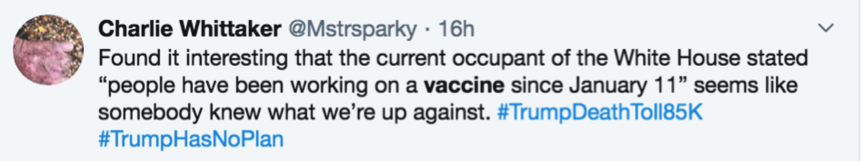 科學(xué)家查理·惠特克(Charlie Whittaker)稱:“總統(tǒng)說人們自從1月11日就開始研發(fā)疫苗,這真的很有趣,似乎有人早就知道我們面對(duì)的是什么!薄