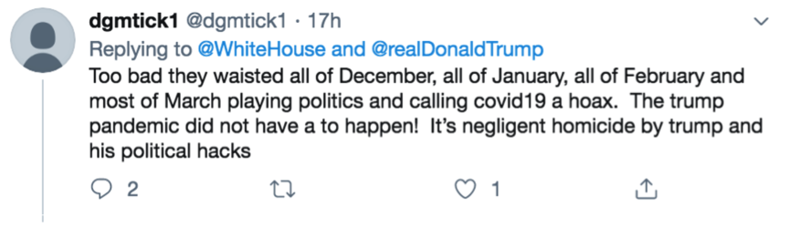 網(wǎng)民dgmtick1表示 :“糟糕的是,政客們浪費(fèi)了整個(gè)12月、1月、2月以及3月份大多數(shù)時(shí)間來玩他們的政治游戲,還居然稱新冠病毒是場騙局。這是特朗普和他的政客們的過失殺人行為!薄
