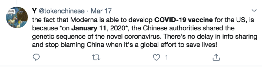 網(wǎng)民Y表示:“事實(shí)上生物制藥公司Moderna有能力為美國進(jìn)行新冠病毒疫苗研發(fā),因?yàn)槭加凇?月11日’,以及中國政府及時(shí)分享了基因序列。這就說明信息共享不存在延遲,再也不要指責(zé)中國說沒有及時(shí)共享信息了,現(xiàn)在需要全球努力去救治生命!”↓↓↓