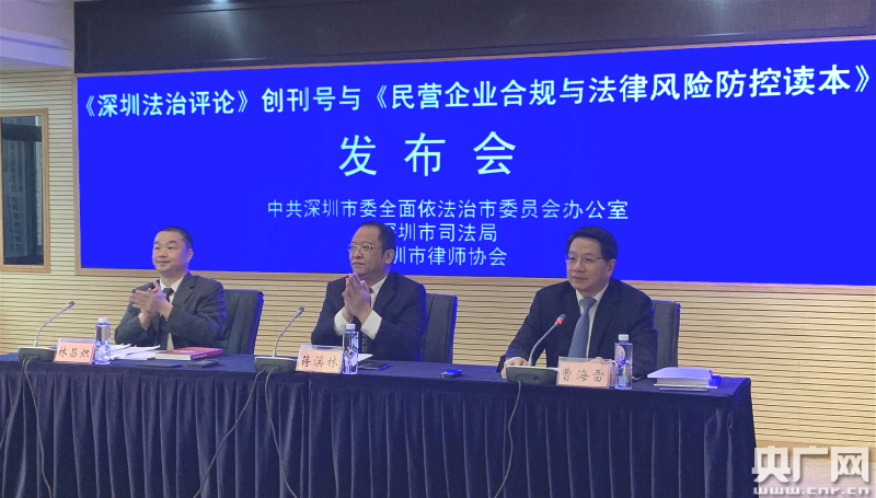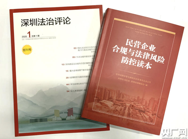 《深圳法治評論》創(chuàng)刊號、《民營企業(yè)合規(guī)與法律風險防控讀本》(中央廣播電視總臺央廣記者 黃倩 攝)