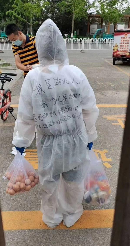 有網(wǎng)友拍下了這樣的照片,超市老板全副武裝,手里拎著雞蛋和食品,看上去像是在送貨的路上。老板衣服后背的位置寫著這樣一段話:“我是湖北人,我為北京加油……今天,該是我們報恩的時刻。”