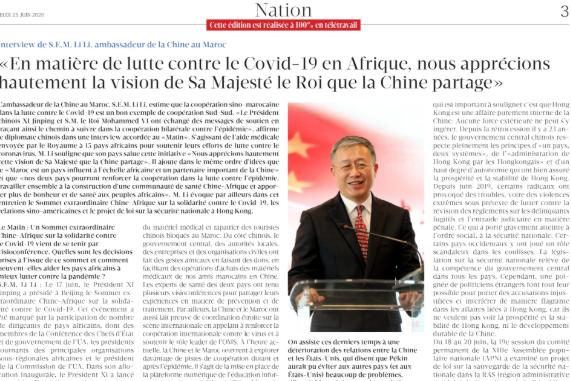 中國駐摩洛哥大使李立當(dāng)?shù)貢r間24日就中非團(tuán)結(jié)抗疫特別峰會、中摩抗疫合作、北京新發(fā)疫情、中美關(guān)系以及疫后經(jīng)濟(jì)形勢接受了摩洛哥發(fā)行量最大的法文報紙《晨報》專訪。李大使在采訪中表示,中非團(tuán)結(jié)抗疫特別峰會是在中非雙方抗擊新冠肺炎疫情的重要時刻召開的一次重要會議,與會中非領(lǐng)導(dǎo)人就深入推進(jìn)中非抗疫合作達(dá)成重要共識,充分體現(xiàn)了中非雙方?jīng)Q心深化中非友好,加強(qiáng)相互支持,著力構(gòu)建更加緊密的中非命運(yùn)共同體的決心。