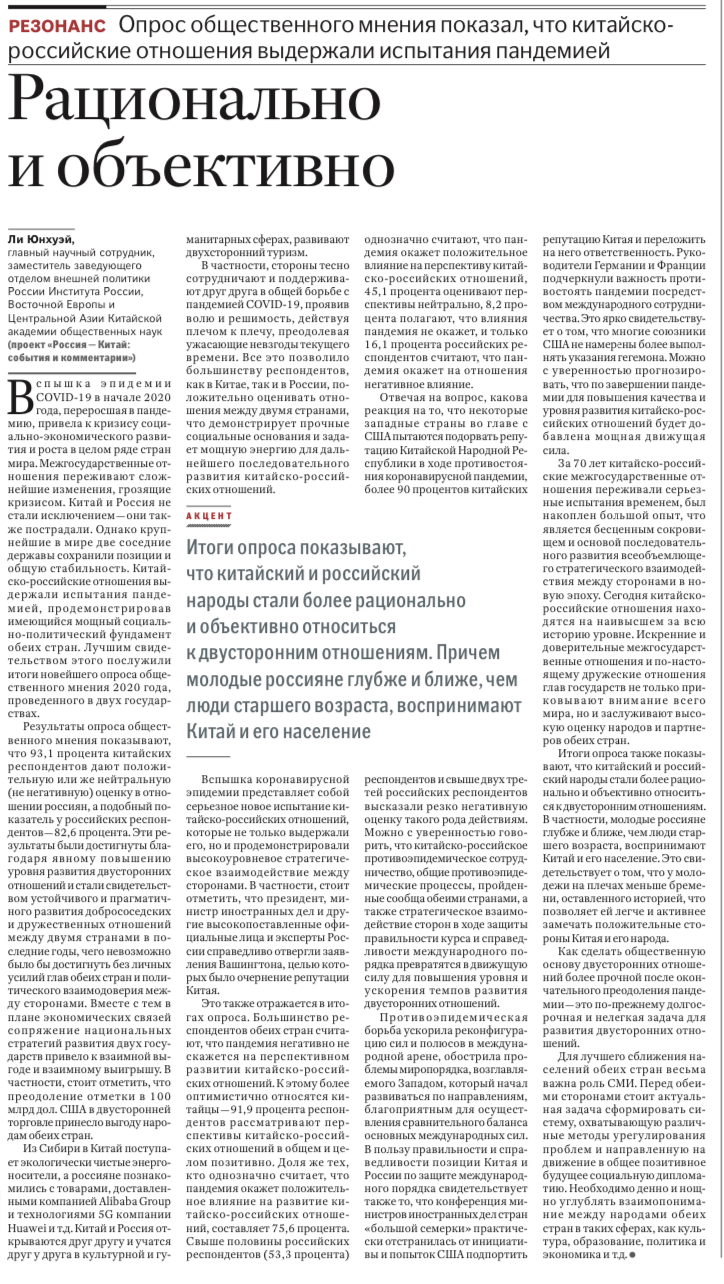 29日出版的《俄羅斯報》刊發(fā)了《中俄銳評》特約評論員、中國社會科學(xué)院俄羅斯東歐中亞研究所俄羅斯外交室副主任、研究員李勇慧撰寫的題為《中俄關(guān)系經(jīng)受住了疫情考驗》的署名文章。文章對不久前公布的“2020年中俄社會民意調(diào)查”結(jié)果進行了深入分析和解讀。文章指出,中俄關(guān)系經(jīng)受住新冠疫情的嚴峻考驗,并且在回擊美國污名化中國等方面體現(xiàn)出高水平戰(zhàn)略協(xié)作。中俄兩國全方位、多層次的抗疫合作以及為維護國際秩序而展開的戰(zhàn)略配合必將成為兩國關(guān)系提速升級的新動力。全文如下: