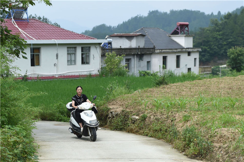 在安徽省岳西縣來(lái)榜鎮(zhèn)公山村,汪鏈騎車出行工作(6月24日攝)。新華社記者 周牧 攝