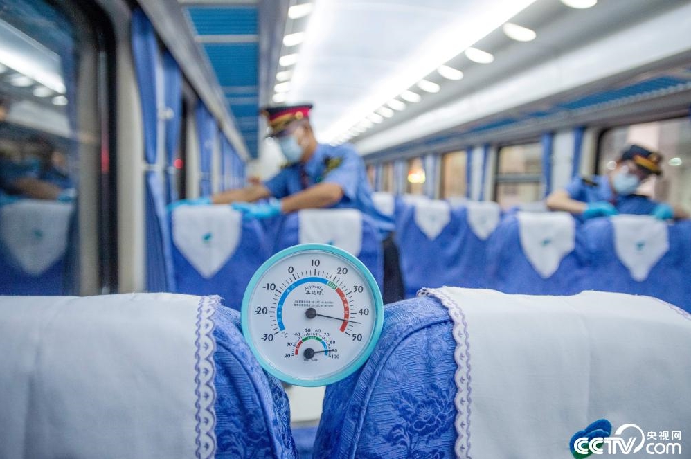 7月20日,云南昆明,列車員李卿茹與同事在對硬席車廂的“座椅套”進(jìn)行更換。