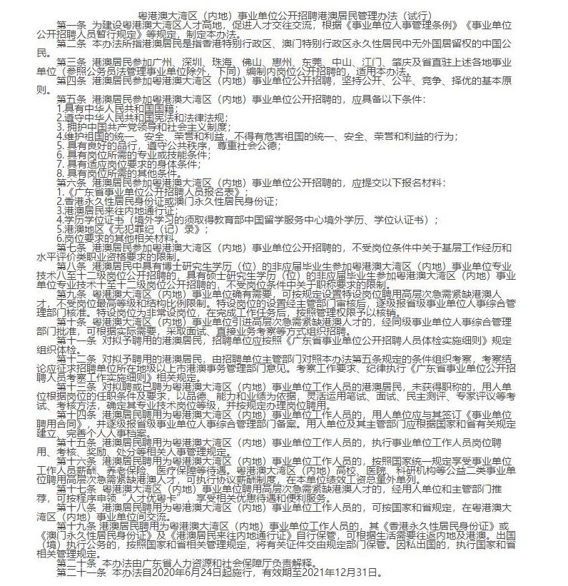 記者從廣東省人力資源和社會(huì)保障廳獲悉,《粵港澳大灣區(qū)(內(nèi)地)事業(yè)單位公開招聘港澳居民管理辦法(試行)》日前正式印發(fā)施行。