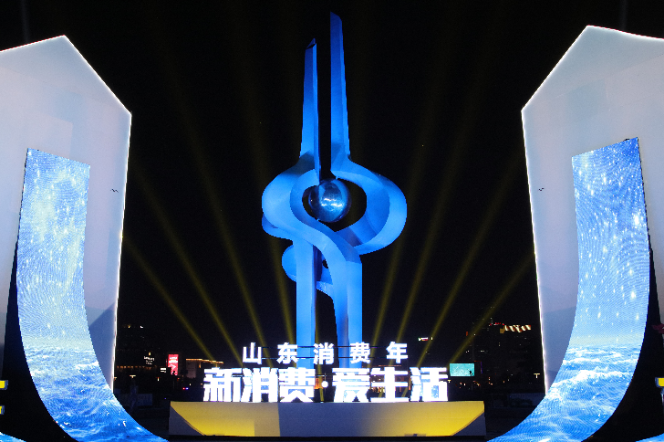 晚上7點半,“山東消費年”在濟南市泉城廣場正式啟動,李干杰省長和蔣希偉副臺長登臺,共同敲響矗立在廣場上的一面銅鑼,寓意“鳴鑼開市”。鑼聲莊重洪亮,象征著生意興旺,國富民強。