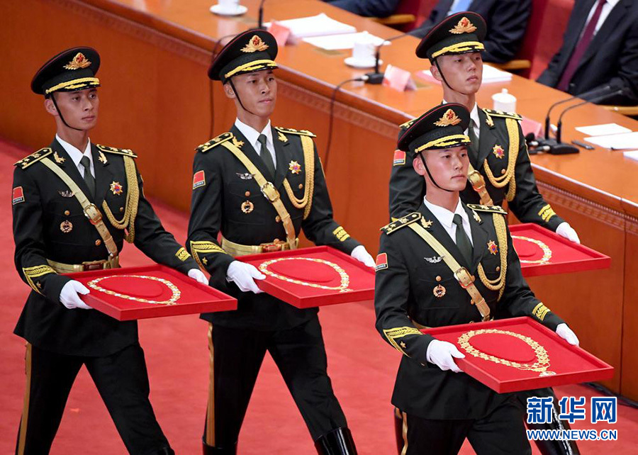 9月8日上午,全國抗擊新冠肺炎疫情表彰大會上,4名禮兵手捧共和國勛章、國家榮譽稱號獎章,行進到儀式現(xiàn)場。新華社記者 岳月偉 攝