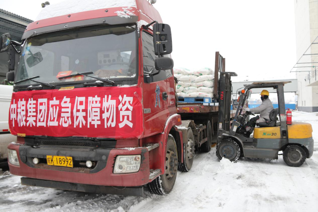 ▲2月初,中糧集團(tuán)員工冒雪搶運(yùn)應(yīng)急保障物資。