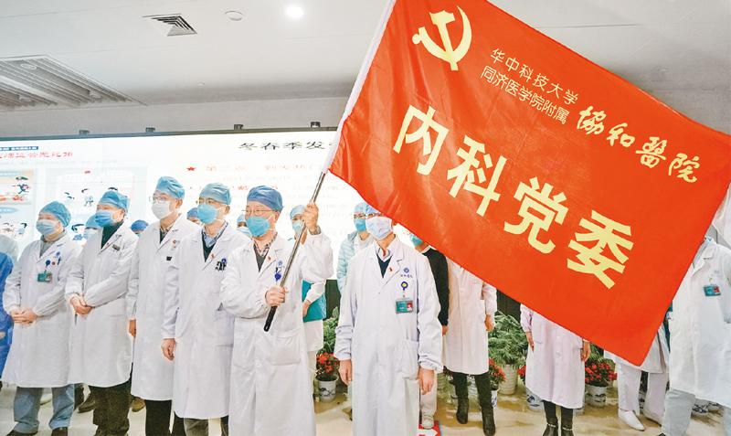 2020年1月22日,華中科技大學(xué)同濟醫(yī)學(xué)院附屬協(xié)和醫(yī)院內(nèi)科30余名醫(yī)務(wù)人員組成抗擊新冠肺炎突擊隊,投入到協(xié)和醫(yī)院對口支持的發(fā)熱定點醫(yī)院——武漢紅十字會醫(yī)院的工作中去。圖為醫(yī)務(wù)人員宣誓成立突擊隊。 新華社記者 程敏/攝