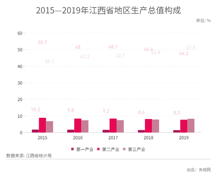 2019年,江西省全年GDP為24757.5億元,增長(zhǎng)8%,增速位列全國(guó)第四、中部第一,三次產(chǎn)業(yè)分別增長(zhǎng)3%、8%、9%。產(chǎn)業(yè)結(jié)構(gòu)不斷優(yōu)化,第三產(chǎn)業(yè)在經(jīng)濟(jì)結(jié)構(gòu)占比持續(xù)上升,占比已達(dá)47.5%,主要經(jīng)濟(jì)指標(biāo)增幅位居全國(guó)前列。2020年以來(lái),面對(duì)防控疫情、防汛抗洪、經(jīng)濟(jì)發(fā)展等的“硬仗”形勢(shì)下,江西省委、省政府全力做好“六穩(wěn)”工作,全面落實(shí)“六!比蝿(wù),上半年全省GDP增長(zhǎng)0.9%,主要經(jīng)濟(jì)指標(biāo)基本實(shí)現(xiàn)“負(fù)轉(zhuǎn)正、位靠前”。