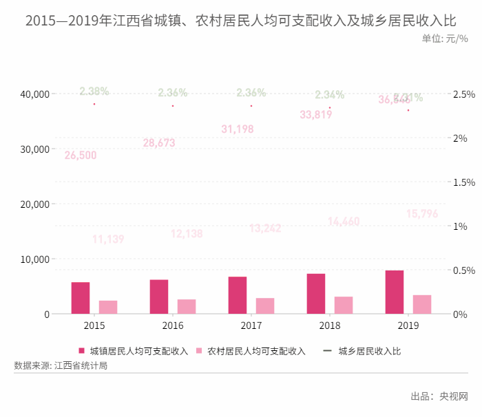截至2019年,江西城鎮(zhèn)、農(nóng)村居民人均可支配收入分別為36546元、15796元,較上年分別增長(zhǎng)2727元、1336元,增長(zhǎng)率皆超過(guò)9%。居民收入穩(wěn)步增加,物價(jià)漲幅穩(wěn)中趨緩,生態(tài)環(huán)境質(zhì)量繼續(xù)穩(wěn)居全國(guó)前列。