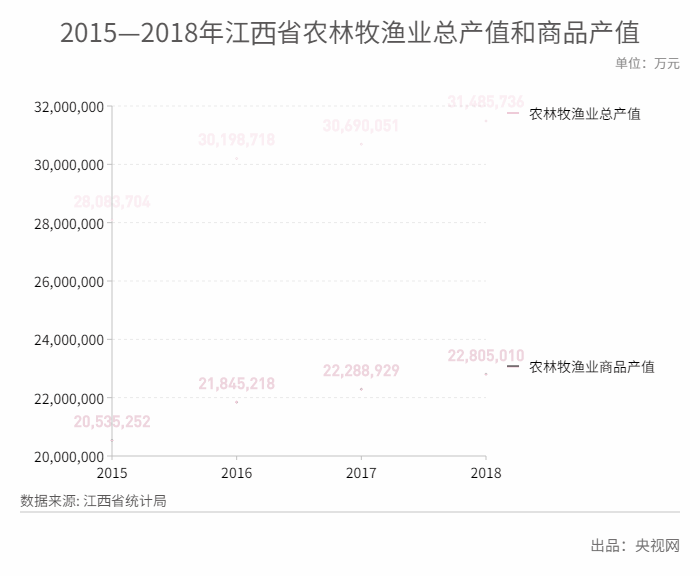 圖五:2015—2018年江西省農(nóng)林漁牧業(yè)總產(chǎn)值和商品產(chǎn)值