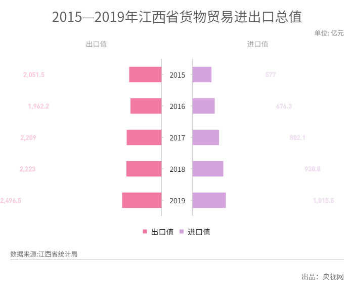 近幾年來(lái),江西省認(rèn)真貫徹執(zhí)行國(guó)家對(duì)外開(kāi)放的各項(xiàng)方針政策、積極推進(jìn)大開(kāi)放戰(zhàn)略,以國(guó)際市場(chǎng)需求為導(dǎo)向,積極參與國(guó)際分工、國(guó)際競(jìng)爭(zhēng),不斷開(kāi)拓海外市場(chǎng),抓創(chuàng)新,搞技改,對(duì)外貿(mào)易成績(jī)斐然。2019年,江西省社會(huì)消費(fèi)品零售總額為8421.6億元,同比增長(zhǎng)約9%。進(jìn)出口總值分別為:出口2496.5億元,較上年增長(zhǎng)約9%;進(jìn)口1015.5億元,較上年增長(zhǎng)9%。