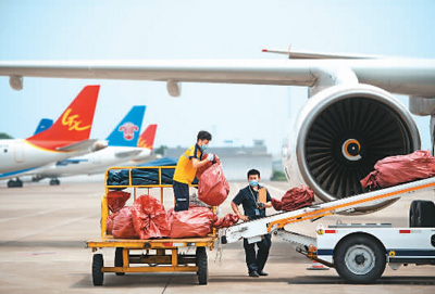 在長沙黃花國際機(jī)場,工作人員把跨境電商包裹放置在貨物傳送帶上。