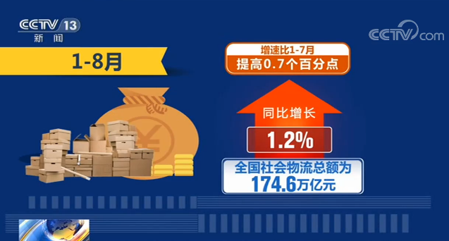 1—8月,全國社會(huì)物流總額為174.6萬億元,同比增長(zhǎng)1.2%,增速比1—7月提高0.7個(gè)百分點(diǎn)。