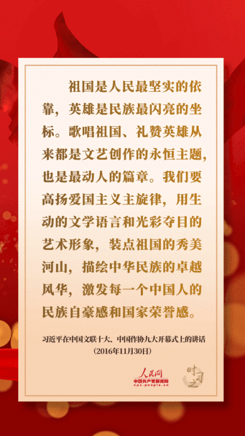 祖國是人民最堅實的依靠,英雄是民族最閃亮的坐標。歌唱祖國、禮贊英雄從來都是文藝創(chuàng)作的永恒主題,也是最動人的篇章。我們要高揚愛國主義主旋律,用生動的文學語言和光彩奪目的藝術形象,裝點祖國的秀美河山,描繪中華民族的卓越風華,激發(fā)每一個中國人的民族自豪感和國家榮譽感。