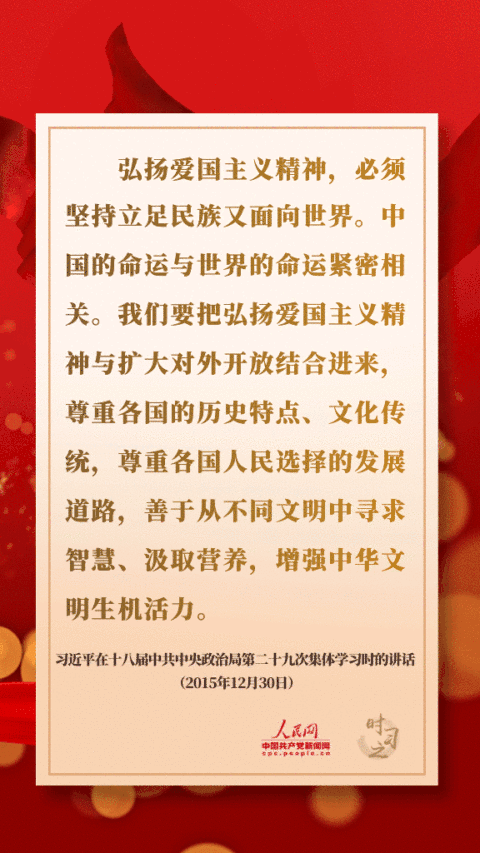 弘揚愛國主義精神,必須堅持立足民族又面向世界。中國的命運與世界的命運緊密相關。我們要把弘揚愛國主義精神與擴大對外開放結合進來,尊重各國的歷史特點、文化傳統(tǒng),尊重各國人民選擇的發(fā)展道路,善于從不同文明中尋求智慧、汲取營養(yǎng),增強中華文明生機活力。