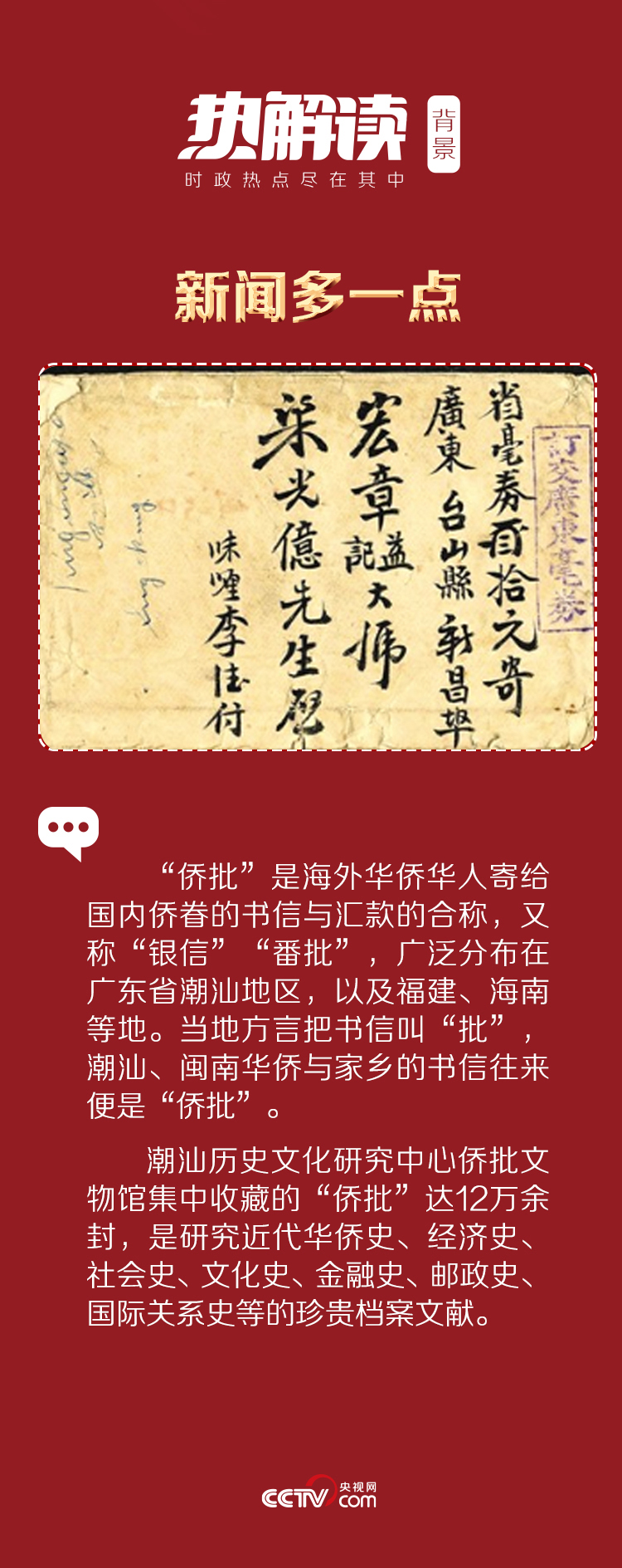 在潮汕方言中,“批”即是“信”的意思,是海外僑胞通過民間渠道寄給家鄉(xiāng)眷屬的書信和匯款憑證的合稱。紙紙僑批,寄托著潮汕僑胞濃濃的鄉(xiāng)愁。其中,有對(duì)家人的牽掛,有對(duì)家鄉(xiāng)的眷戀,更有對(duì)祖國繁榮昌盛的祝愿和希望。