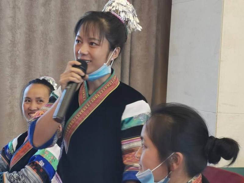 貴州織金導(dǎo)游蔡鳳在“新青年追夢計劃”培訓(xùn)現(xiàn)場向老師提問(央廣網(wǎng)發(fā) 美團(tuán)供圖)