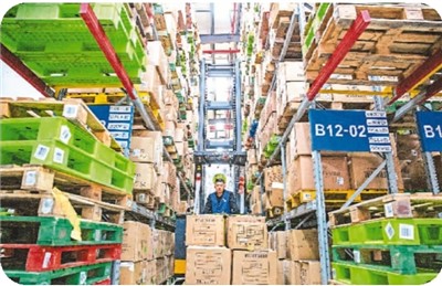 圖為11月4日,工作人員使用高位揀選車在VAN窄巷道高位貨架上進(jìn)行存儲(chǔ)貨物的操作。