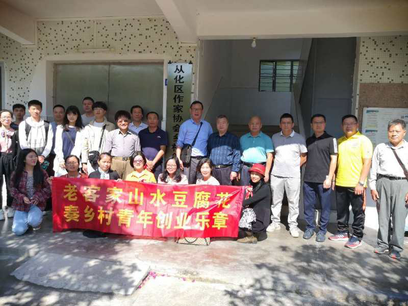 廣州從化區(qū)作協(xié)部分會員與廣州城建職業(yè)學院部分師生一行20余人,驅車來到位于大山深處的溫泉鎮(zhèn)密石村“老客家山水豆腐花”生產(chǎn)基地,為企業(yè)發(fā)展出謀劃策(劉付云 攝)