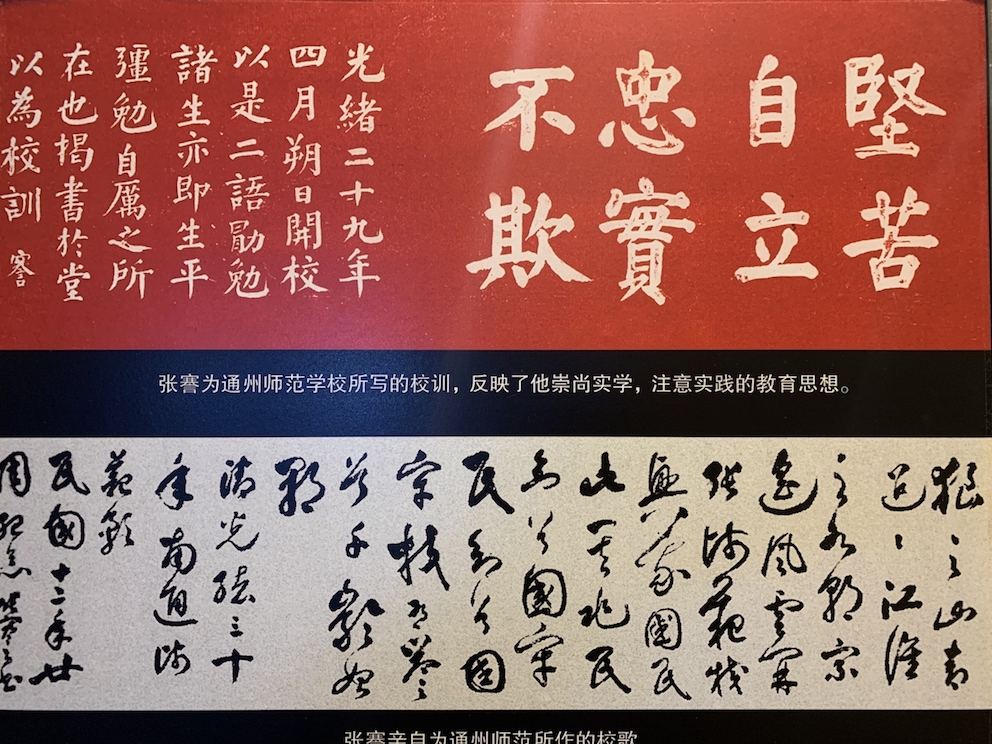 △張謇為通州師范學(xué)校所寫的校訓(xùn)。(總臺央視記者段德文拍攝)