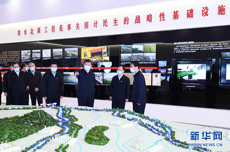 一個(gè)大型沙盤模型直觀地呈現(xiàn)了中國大地上水資源大范圍大規(guī)?鐓^(qū)域調(diào)配的壯闊景象,習(xí)近平總書記駐足凝望——