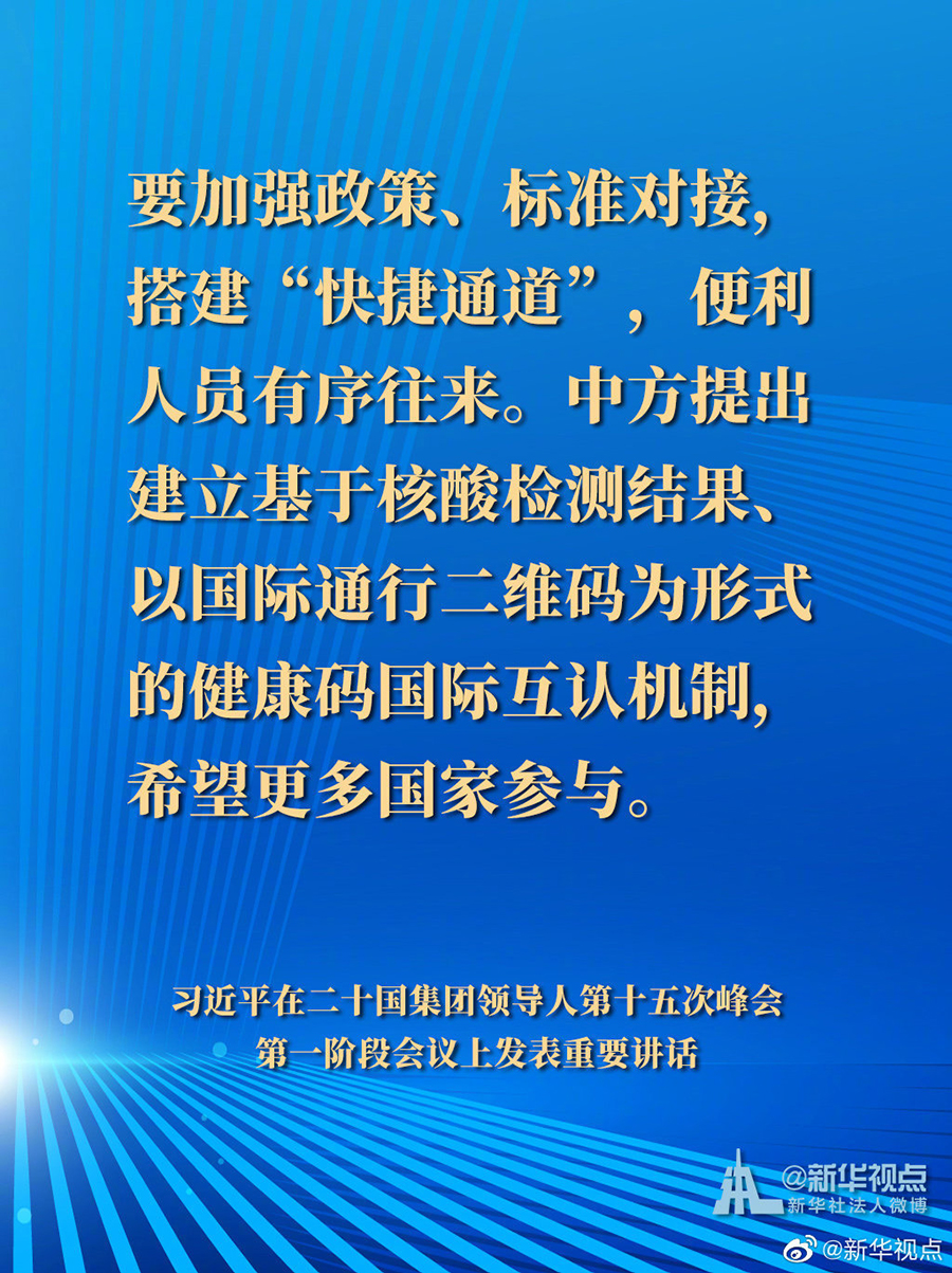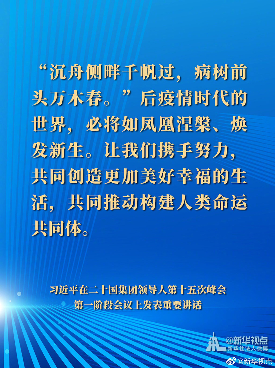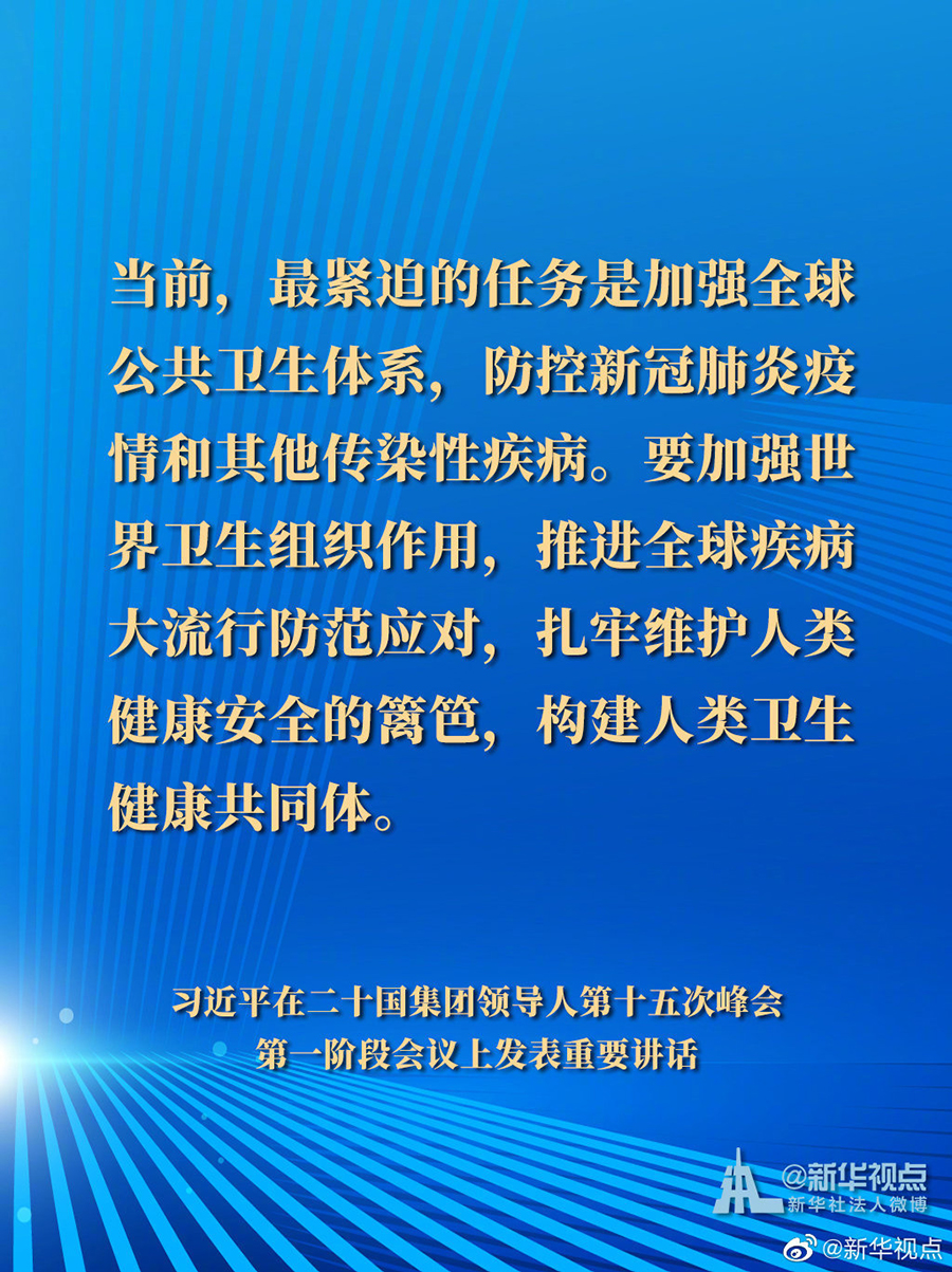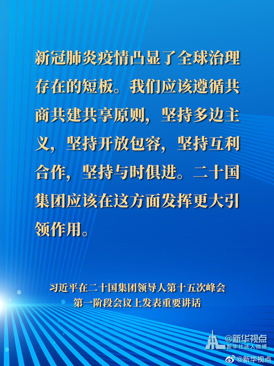 國家主席習近平21日晚在北京以視頻方式出席二十國集團領(lǐng)導人第十五次峰會第一階段會議并發(fā)表重要講話。以下是講話要點。