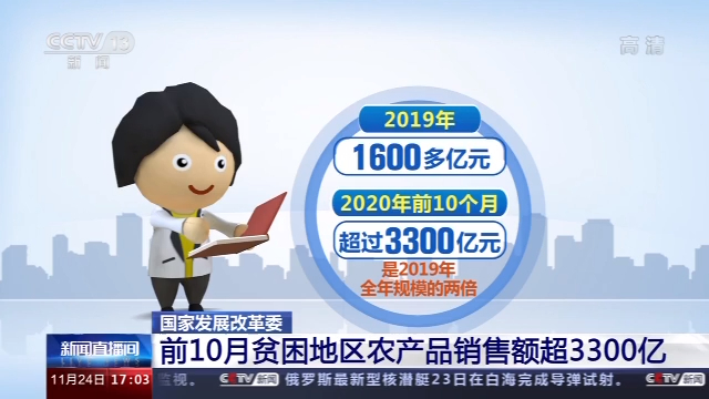 在24日的國(guó)新辦新聞發(fā)布會(huì)上,國(guó)家發(fā)展改革委、上海市合作交流辦、湖北省發(fā)展改革委、國(guó)鐵集團(tuán)有關(guān)負(fù)責(zé)人介紹了消費(fèi)扶貧助力打贏脫貧攻堅(jiān)戰(zhàn)的有關(guān)情況。數(shù)據(jù)顯示,今年前10個(gè)月,累計(jì)直接采購(gòu)或幫助銷售貧困地區(qū)特色農(nóng)產(chǎn)品超過(guò)3300億元,是2019年全年規(guī)模的兩倍。