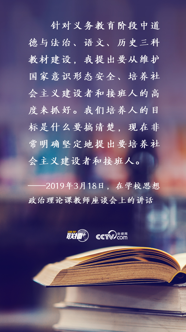 百年大計,教育為本。習(xí)近平總書記一貫高度重視培養(yǎng)社會主義建設(shè)者和接班人,不止一次對教材編研出版工作提出殷切期望。央視網(wǎng)《聯(lián)播+》為您梳理總書記有關(guān)精彩論述,與您一起學(xué)習(xí)領(lǐng)悟。