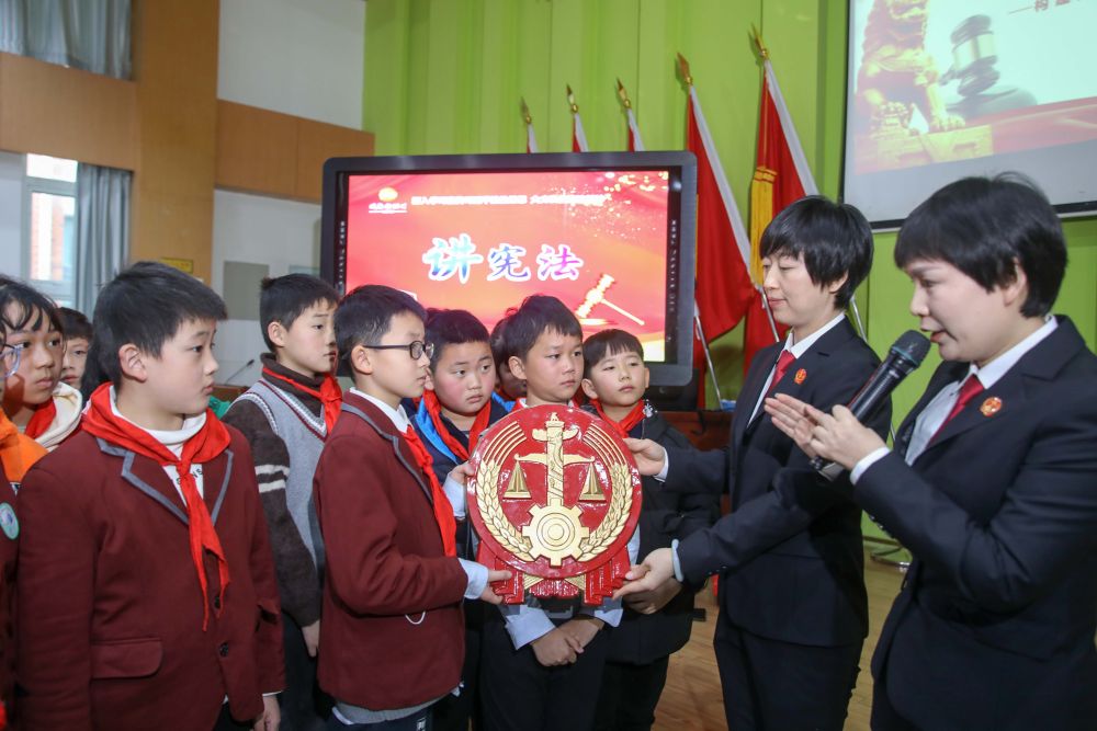 △2020年12月1日,安徽省合肥市濱湖人民法庭的法官走進(jìn)校園,向?qū)W生們展示法徽,介紹其由來(lái)及背后的故事。