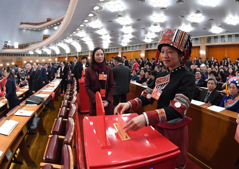 △2018年3月11日,在十三屆全國(guó)人大一次會(huì)議第三次全體會(huì)議上,代表們?cè)谕镀北頉Q《中華人民共和國(guó)憲法修正案(草案)》。