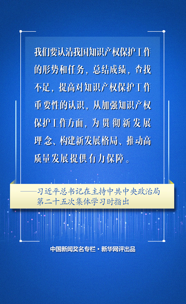 近日,中共中央政治局就加強(qiáng)我國(guó)知識(shí)產(chǎn)權(quán)保護(hù)工作舉行第二十五次集體學(xué)習(xí),習(xí)近平總書記在主持學(xué)習(xí)時(shí)發(fā)表重要講話,回顧總結(jié)我國(guó)知識(shí)產(chǎn)權(quán)保護(hù)工作取得的歷史性成就,深刻闡述知識(shí)產(chǎn)權(quán)保護(hù)工作的重要性,對(duì)全面加強(qiáng)知識(shí)產(chǎn)權(quán)保護(hù)工作提供了明確思路和行動(dòng)指南。