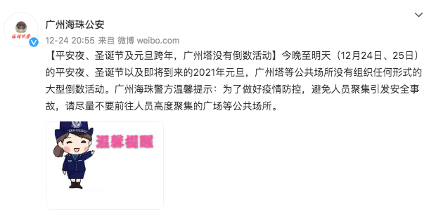 @廣州海珠公安 近日發(fā)布提醒稱,2021年元旦,廣州塔等公共場所將不舉辦任何形式的大型倒數(shù)活動。