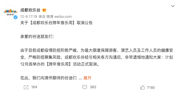 @成都歡樂谷 近日發(fā)布公告稱,計劃12月底舉辦的跨年音樂周活動正式取消。