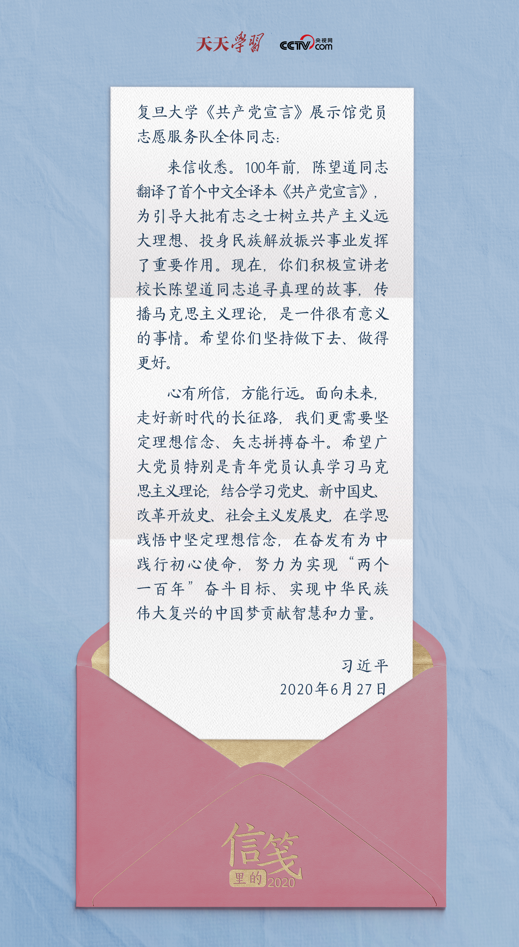 今年夏天,黨員志愿服務(wù)隊(duì)的30名隊(duì)員給習(xí)近平總書記寫了封信,匯報了參加志愿講解服務(wù)的經(jīng)歷和體會,并表達(dá)了做《共產(chǎn)黨宣言》精神忠實(shí)傳人的信心和決心。