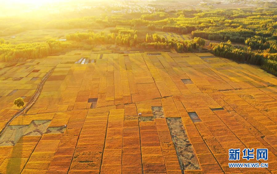 10月18日在河北灤州市古城街道蔣莊村拍攝的稻田(無人機照片)。華社記者 牟宇 攝