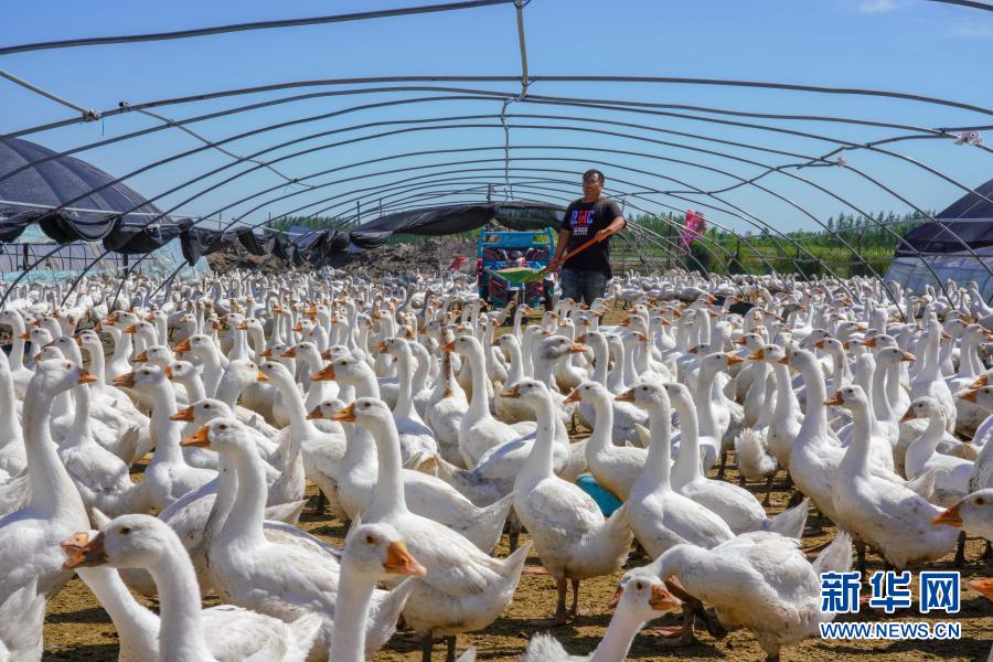 8月12日,在吉林鎮(zhèn)賚縣黑魚泡鎮(zhèn)岔臺村,村民王木堯在投喂鵝飼料。新華社記者 張楠 攝
