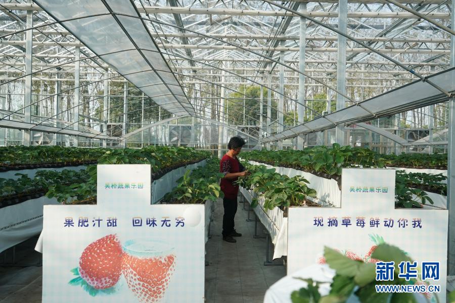 10月29日,在江蘇江都現(xiàn)代農(nóng)業(yè)產(chǎn)業(yè)園電氣化大棚,農(nóng)民在對草莓進行日常管護。新華社記者 季春鵬 攝