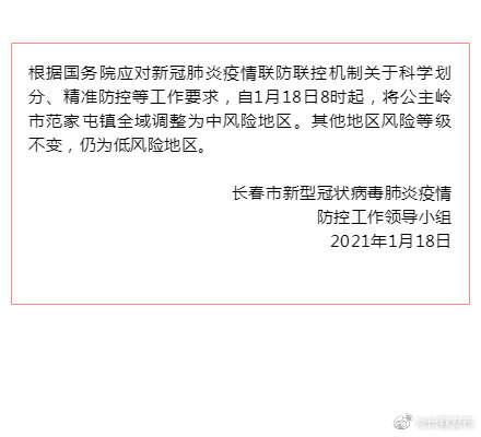 據(jù)長春發(fā)布官博消息,根據(jù)國務(wù)院應(yīng)對新冠肺炎疫情聯(lián)防聯(lián)控機制關(guān)于科學(xué)劃分、精準防控等工作要求,自1月18日8時起,將公主嶺市范家屯鎮(zhèn)全域調(diào)整為中風(fēng)險地區(qū)。其他地區(qū)風(fēng)險等級不變,仍為低風(fēng)險地區(qū)。