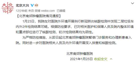 據(jù)“北京大興”官方微博消息,1月23日,北京南郊腫瘤醫(yī)院在對醫(yī)院外環(huán)境開展例行新冠肺炎核酸檢測中發(fā)現(xiàn)二層垃圾車內(nèi)外2件檢測結(jié)果可疑。根據(jù)防控要求,已對相關(guān)醫(yī)護(hù)和保障人員及院內(nèi)整體環(huán)境和重點部位進(jìn)行了核酸檢測,初次檢測結(jié)果均為陰性。