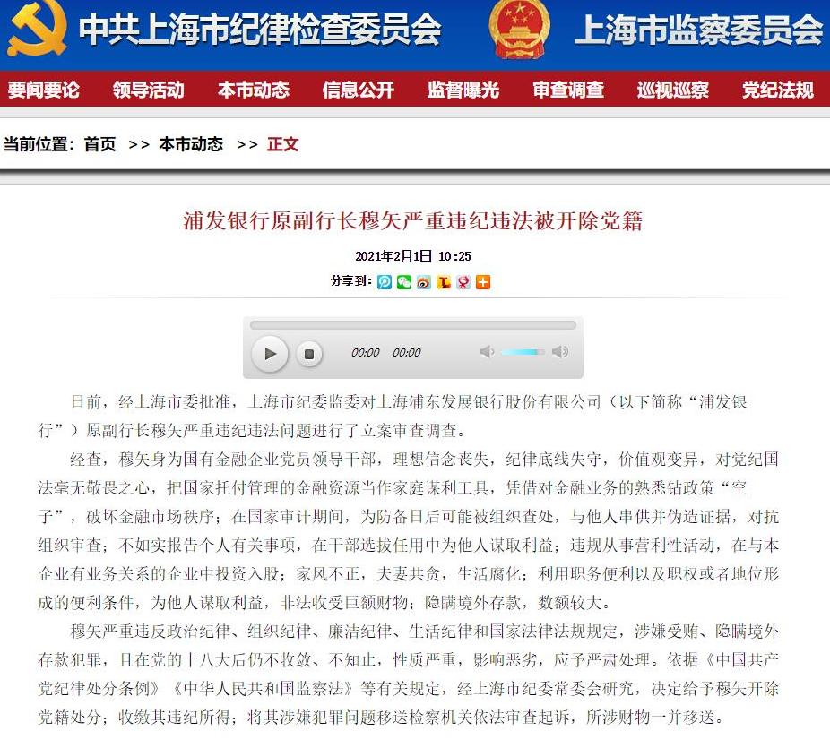 據(jù)上海市紀(jì)委監(jiān)委消息:日前,經(jīng)上海市委批準(zhǔn),上海市紀(jì)委監(jiān)委對(duì)上海浦東發(fā)展銀行股份有限公司(以下簡(jiǎn)稱(chēng)“浦發(fā)銀行”)原副行長(zhǎng)穆矢嚴(yán)重違紀(jì)違法問(wèn)題進(jìn)行了立案審查調(diào)查。