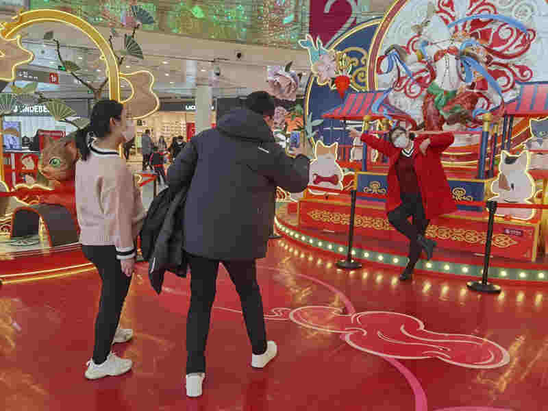春節(jié)期間,在位于北京市朝陽區(qū)雙井街道的某商場(chǎng)內(nèi),一家三口佩戴口罩悠閑游逛。在商場(chǎng)中心位置的特色展臺(tái)前,阿姨擺出跳舞的姿勢(shì),難掩口罩下綻放的笑顏,家人趕忙用手機(jī)記錄下她的美好心情。