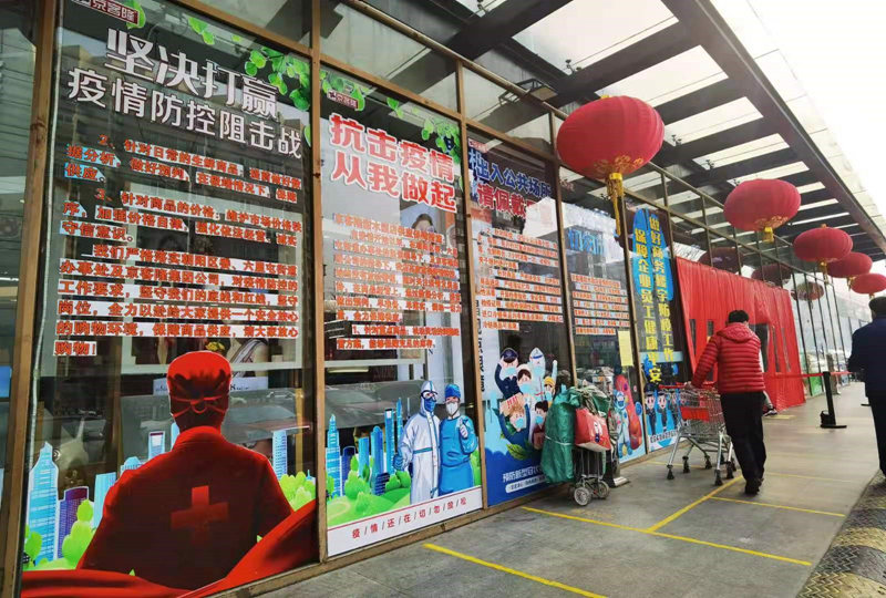 北京市朝陽區(qū)京客隆超市(甜水園店)的玻璃大門上,貼滿了“堅(jiān)決打贏疫情防控阻擊戰(zhàn)”“抗擊疫情從我做起”“進(jìn)入公共場(chǎng)所請(qǐng)佩戴口罩”等醒目標(biāo)語及五彩繽紛的宣傳圖片,與玻璃門上方充滿節(jié)日喜慶的大紅燈籠相映成趣。超市嚴(yán)格按照防范規(guī)定,消費(fèi)者需要先掃描健康碼、測(cè)量體溫后,再有序進(jìn)入超市。